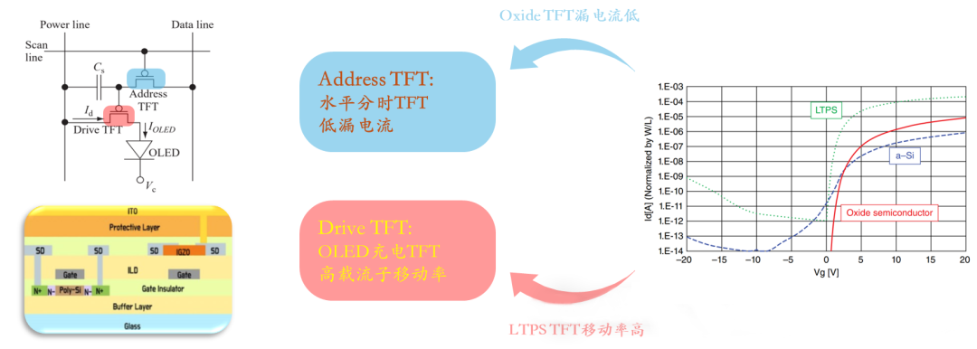 Tá teicneolaíocht backplane ríthábhachtach chun taispeántais AMOLED ardchaighdeáin a bhaint amach. Ní raibh TFTanna sileacain luath-éagruthacha (a-Si:H) leordhóthanach chun picteilíní OLED a thiomáint go héifeachtach mar gheall ar a soghluaisteacht íseal agus cobhsaíocht neamhleor. Faoi láthair glacann an tionscal go forleathan réitigh sileacain polycrystalline íseal-teocht (LTPS) TFT agus (Ocsaíd) réitigh backplane TFT. Cuireann LTPS ard-soghluaisteacht iompróra ar fáil, rud a fhágann go bhfuil sé oiriúnach chun astaíochtaí solais a thiomáint, agus léiríonn TFTanna Ocsaíd sruth sceite an-íseal, rud a chabhraíonn le staid picteilín a choinneáil.