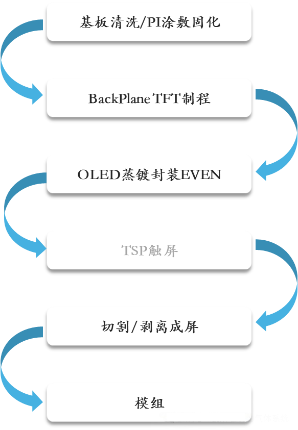 Tá roinnt próiseas aonaid thar a bheith teicniúil i gceist le croíphróiseas monaraíochta AMOLED. I bpróiseas Backplane TFT (BP), tá teicneolaíocht Íseal-Teocht Polycrystalline Silicon (LTPS) tar éis éirí mar phríomhshrutha mar gheall ar a soghluaisteacht ard leictreon. Áirítear lena phróiseas struchtúir barr-gheata céimeanna cosúil le sil-leagan ciseal maolánach, ionchlannú ian cainéal, criostalú annealaithe léasair (ELA), sputtering miotail geata, agus ionchlannú draein foinse. Tá ról ríthábhachtach ag gáis speisialta maidir le sil-leagan, modhnú agus eitseáil scannán tanaí: mar shampla, úsáideann próisis PECVD SiH₄/N₂O/NH₃ chun scannáin thanaí a-Si/SiNx/SiOx a chur i dtaisce; Fostaítear TMA agus H₂O chun sraitheanna inchochlaithe Al₂O3 a fhoirmiú; baineann eitseáil thirim amach patrúnú ardchruinneas trí gháis mar CF4/SF6/Cl2, áit a n-úsáidtear BCl3 chun sraitheanna ocsaíd miotail a laghdú, agus gineann Cl2 táirgí eitseála so-ghalaithe, rud a chinntíonn próiseas glan agus éifeachtach.