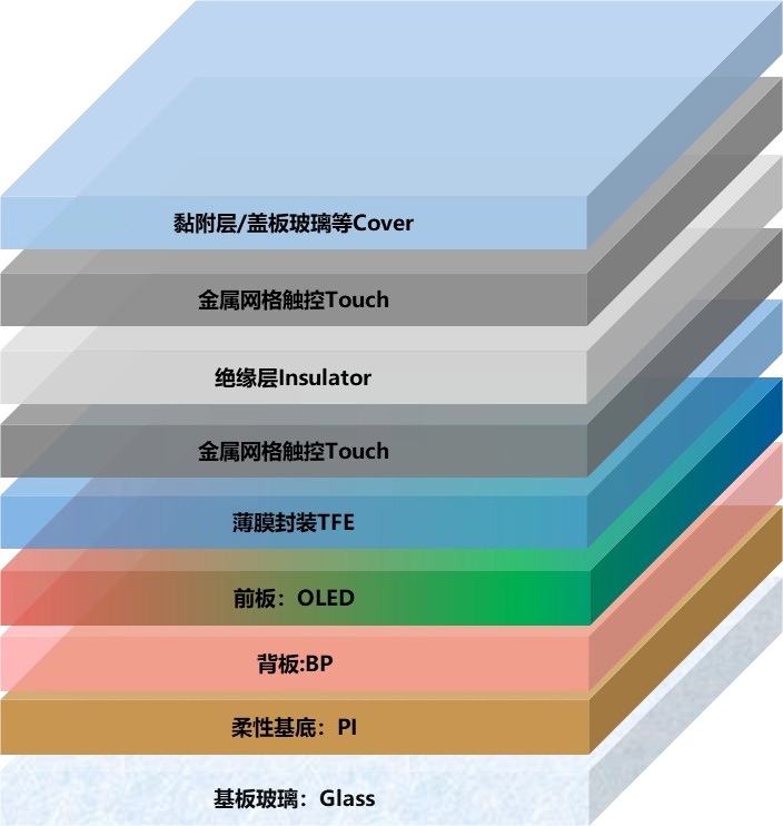 Cuimsíonn an próiseas déantúsaíochta solúbtha AMOLED príomhchéimeanna ar nós glanadh foshraithe/brataithe PI, ullmhú backplane TFT, galú agus imchochlú OLED, comhtháthú modúl tadhaill, ardú léasair, agus cóimeáil modúil.